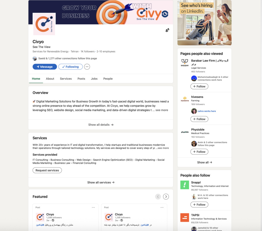 تیم Civyo علاوه بر اجرای پروژه‌های حرفه‌ای برای سایر برندها، پروفایل لینکدین برند خود یعنی شرکت سیویو را نیز بهینه‌سازی کردند. این کار با هدف معرفی دقیق‌تر خدمات مشاوره، نمونه‌کارها و تخصص تیم انجام شد و باعث افزایش اعتبار برند در فضای لینکدین شد.