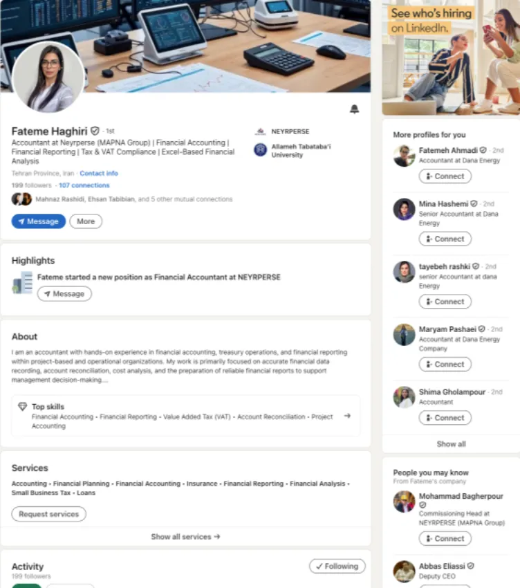 پروژه بهینهسازی لینکدین خانم فاطمه حقیری، کارشناس حسابداری شرکت Neyrperse (MAPNA Group)، توسط تیم Civyo با هدف نمایش حرفهایتر مسیر شغلی و تقویت جایگاه تخصصی ایشان در حوزه حسابداری و مالی اجرا شد. در این پروژه، متن معرفی (About)، عنوان شغلی (Headline)، تجربههای کاری و مهارتها و بقیه موارد را بر اساس استانداردهای رسمی لینکدین بازنویسی و ساختاردهی شدند تا پروفایل ایشان شفافتر، منسجمتر و برای جستجوهای استخدامی و حرفهای اثرگذارتر دیده شود.