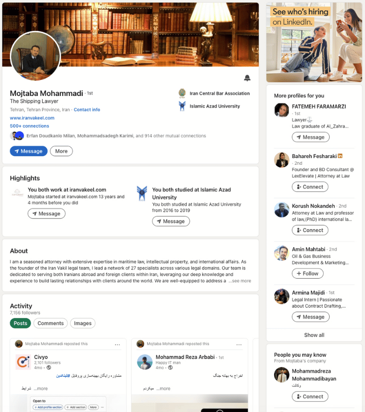 در این پروژه، تیم Civyo پروفایل لینکدین دکتر مجتبی محمدی، وکیل پایهیک و مدیرعامل ایران وکیل را بازطراحی کرد. تمرکز اصلی بر نمایش تخصص ایشان در حقوق دریایی، کشتیرانی و قراردادهای بینالمللی بود. با بازنویسی محتوای کلیدی، استفاده از کلیدواژههای هدفمند و طراحی بنر اختصاصی، پروفایل به یک مرجع حرفهای برای همکاریهای حقوقی در حوزه تجارت و حملونقل دریایی تبدیل شد.